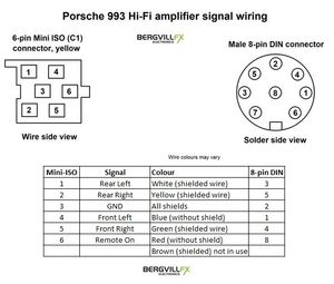 Kabelsett for installasjon av en ettermarked forsterker i stedet for den originale M490 Nokia Hi-Fi-forsterkeren i Porsche 993.